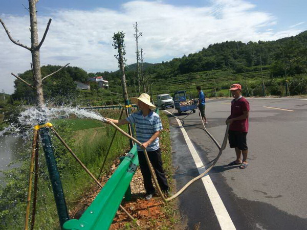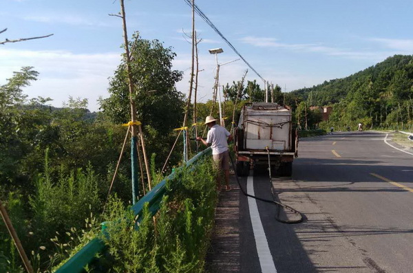 三是全面加强夏季养护。针对当前连续高温的严峻天气形势,林业局安排原5名养护专班人员不间断浇水基础上,目前又组织两辆水罐车加紧对绿道两侧新栽树木进行浇水,保证树木水份供应,并适时进行培土、除草、剪枝修整、病虫害防治等。
